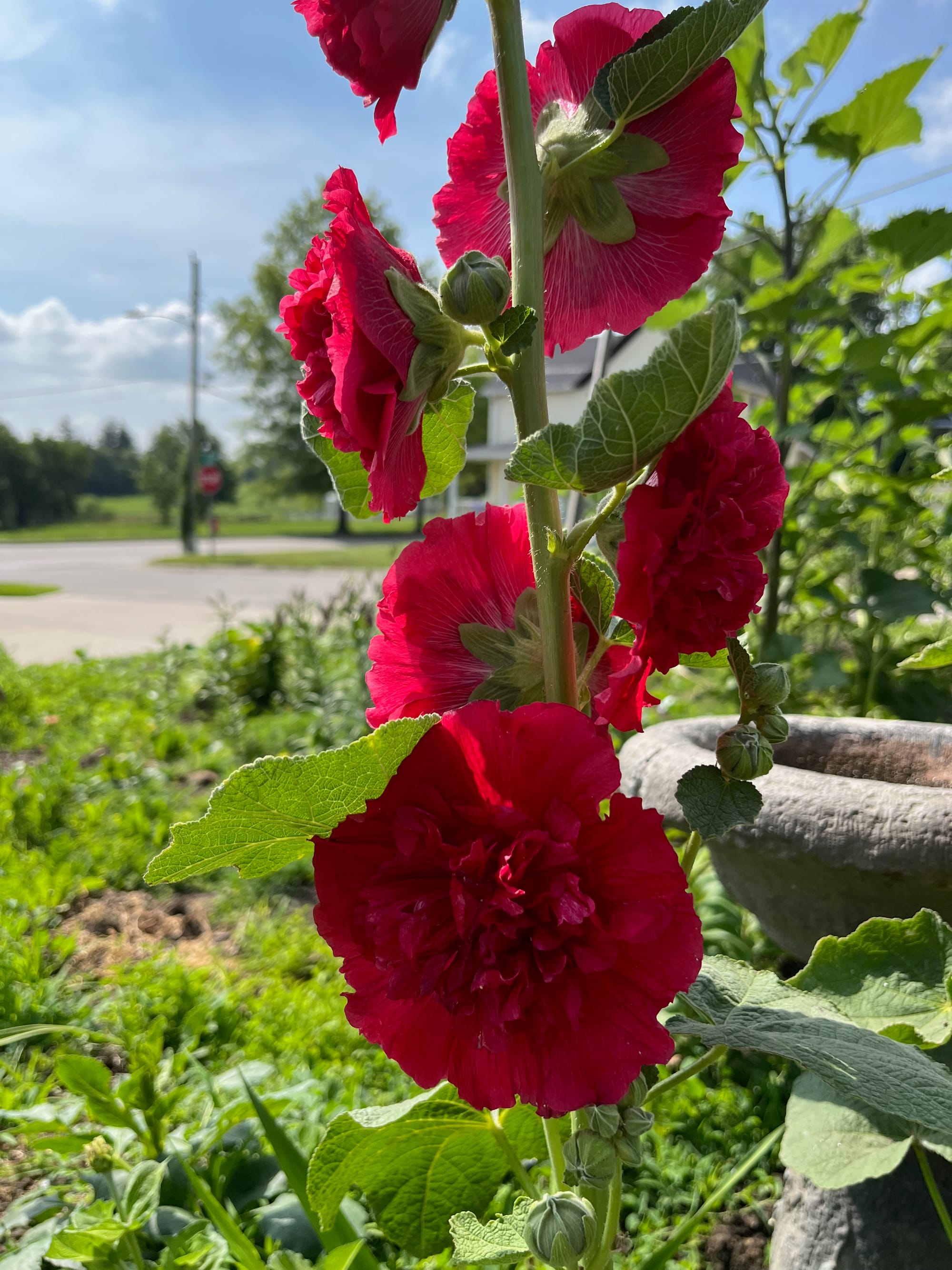 Last year, I found a bag of what looked like mixed color hollyhock "roots" at some place like Home Depot or Lowe's. I thought it would get me started with more established plants that were much more likely to bloom in the first year. Well, they didn't bloom the first year. I might as well have planted seeds of some very specific, unique varieties. (I sell a lot of these in my Etsy shop.) Every time I grow a hollyhock, I'm blown away by it. The roots sent up multiple plumes of double cardinal red flowers this year. Still very impressive and worth the wait. I will probably have a thousand seeds off this one plant. Enough double red hollyhock seeds to last a lifetime. In person, they really did look bright and bold enough to make people stop and double-take.