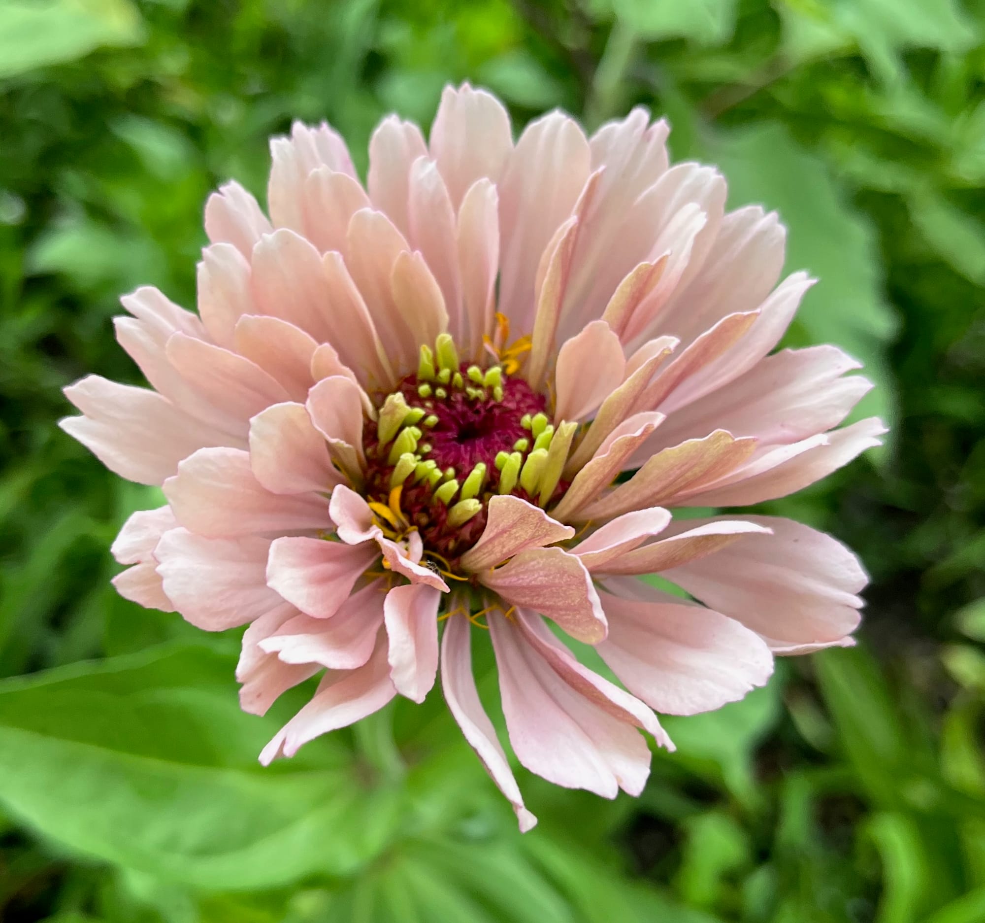 The zinnias are starting to bloom. I'm on a mission to bring back more purple cactus varieties. After discussing the color genetics with a friend who knows a lot more than me, we decided I should eliminate everything that isn't either purple, light purple, mixed purple and white, or white. Adding other colors can force out the expression of the purple. Of course I'm not actually getting rid of every zinnia that isn't that particular color. I will keep unique or interesting colors like the one above that is now opening, with sort of a beige, dusty rose color. It's more beige in person than it looks in the photo. I wanted to call it a "Café au Lait" zinnia, because it kind of reminds me of that creamed coffee, pale pink you can see with that dahlia variety. I'm not in love with the form of the petals so far, but we'll see how it does. Flowers that get this type of coloration often have a warm color and a cool color fighting each other. Like a lavender and a pink on the same bloom. Which can also lean towards one color or the other, or be fairly neutral in the beige range. I'm also thinking of Koko Loko Rose. Even on those plants, different blooms can move between those two opposing colors. You might see a bloom more in the apricot range, or one more in the lavender range. Hopefully you get lots of blooms in the middle, and it reminds you of coffee creamer.